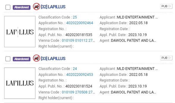 目前公司旗下藝人僅有Lapillus和菲律賓組合HORI7ON。關於Lapillus,最近有消息稱其商標已被「放棄」。根據韓國專利局的數據庫,放棄日期為2024年3月8日,原因為「未繳納註冊費」。由於目前公司員工僅剩不到5人,活動預計將非常困難。