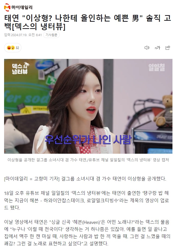 Dex接著問:「所以這個有點瘋狂的女人得到了她想要的男人,然後就離開了。讓我問個正式的『Dex的冰箱訪談』問題,太妍的理想型是什麼?這一切都是為了這個問題鋪路!從新歌介紹開始我就想問了!」