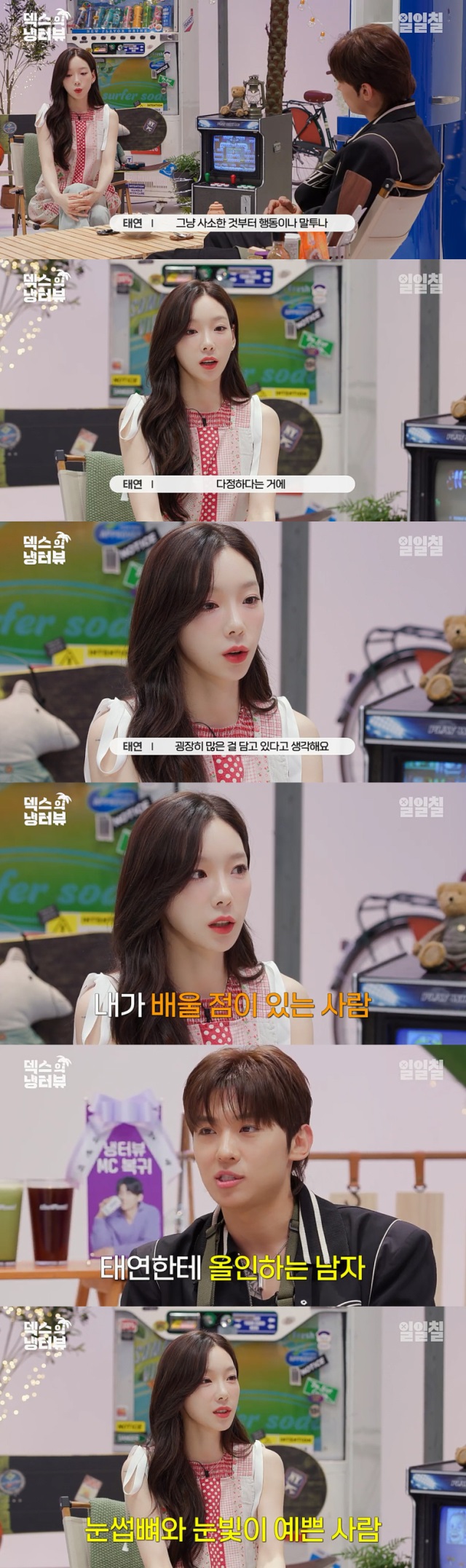 太妍透露:「我的理想型是即使在小事上也善良溫柔的人,在行動和言詞上都如此。我相信善良包含了很多東西。還有,可以讓我學習的人。」,Dex問還有沒有其他特質,因為這些似乎更偏向內在特質。