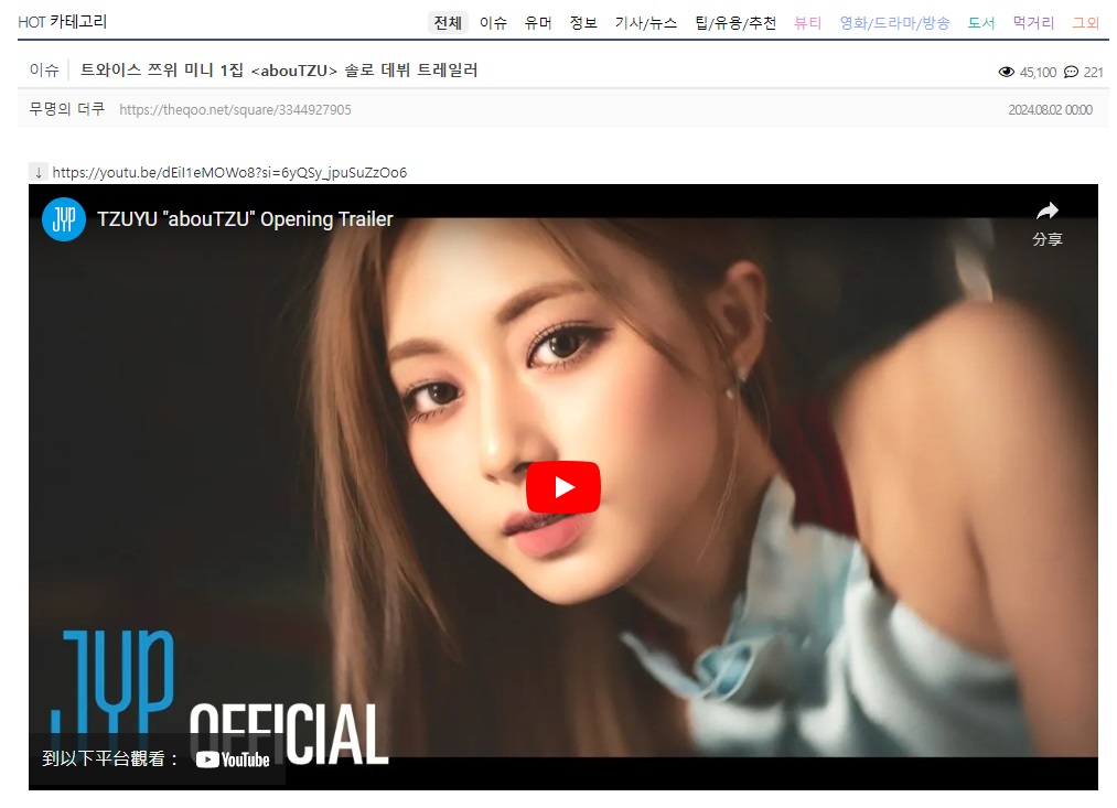 8月1日,JYP娛樂公開了子瑜首張迷你專輯《abouTZU》的開場預告片,這是TWICE忙內成員的Solo出道作品。預告片迅速在各大社群媒體上爆紅,顯示出ONCE們的高度期待。