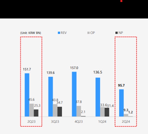 「營業收入」為957億韓元,主營業務的「營業利潤」為93億韓元。與去年同期相比,營收和利潤均大幅下降。營業收入減少了36.9%,營業利潤減少了79.6%。