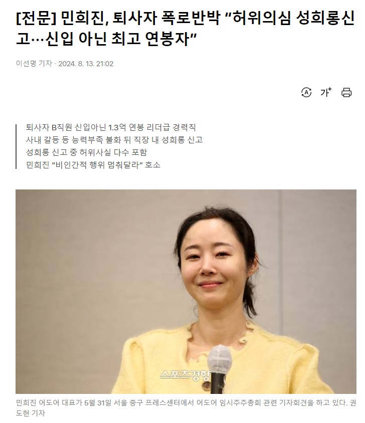 8月13日,閔熙珍發表聲明駁斥這些指控,表示「B」並非基層員工,而是一名高薪職位,年薪高達1億3千萬韓元,是 ADOR 薪資最高的員工。