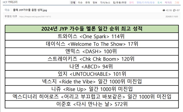 JYP娛樂所屬歌手在韓國數位排行榜(上半年)的成績已在韓國網路社區上公開,引發熱議。