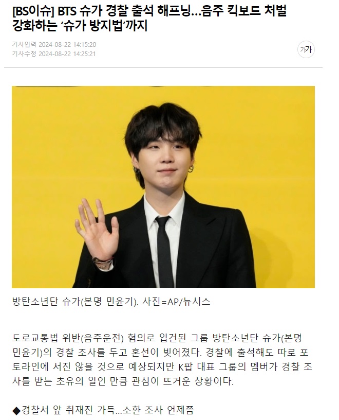 因為「酒駕」被捕的BTS成員「SUGA」事件引發了韓國國會的討論。為了防止電動滑板車/電動機車無照或酒駕的情況,韓國國會正在推動相關法案。