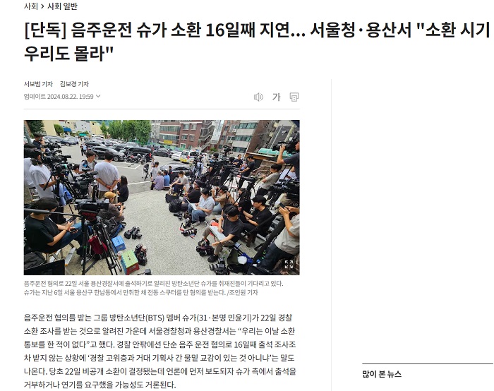龍山警察署長在與韓國媒體的通話中表示:「我不清楚報導中提到的22日確定召喚是如何出現的。目前我們正在與SUGA方面協調召喚調查的日期,也有可能本週內無法進行調查。」