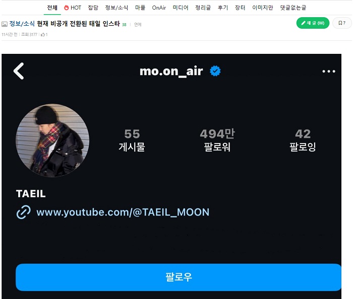 目前,他的官方Instagram帳號已設定為非公開,此外,泰一的個人YouTube頻道「TAEIL MOON」也同樣如此,頻道中的所有內容已經刪除,僅顯示「此頻道沒有任何內容」的訊息。