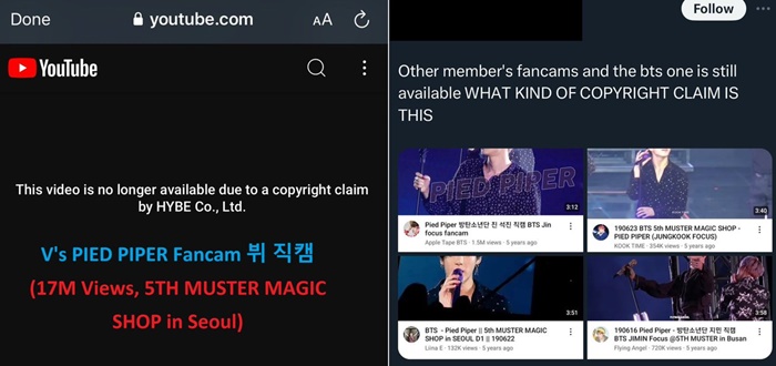 根據粉絲分享的截圖,HYBE向YouTube提出了「版權侵權」的申訴,導致這些影片被刪除。