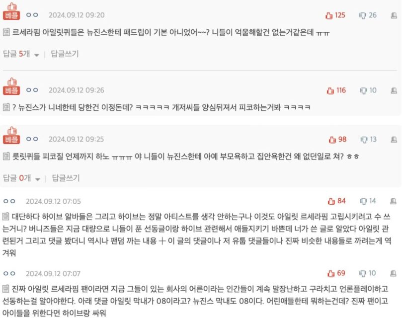 9月12日,ILLIT最近影片下的評論截圖在網路上瘋傳。其中,在網路社區pann的評論區,許多NewJeans粉絲指責ILLIT就是那個被指示要無視NewJeans的團體。