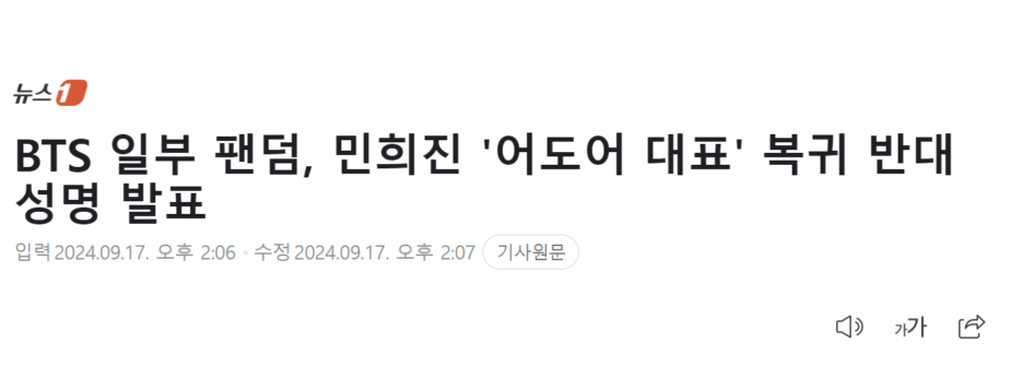 根據News1報導,「部分BTS粉絲」集體表達了對閔熙珍回歸ADOR代表的反對,聲稱她的回歸將對BTS及其粉絲群產生負面影響。