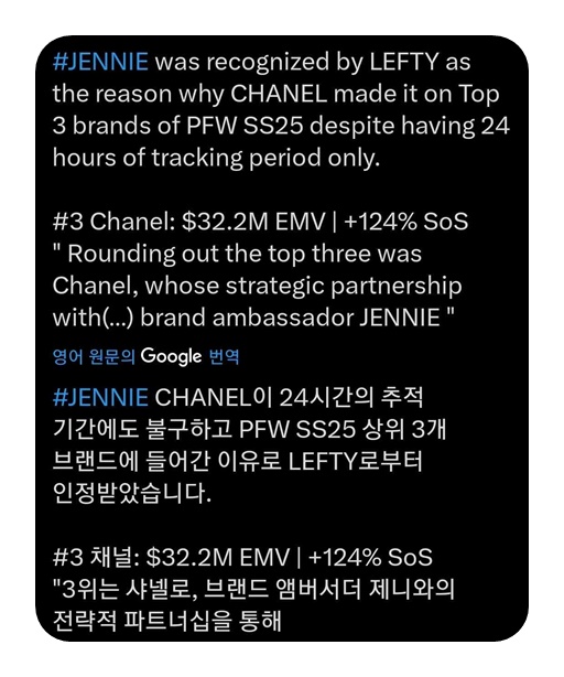 ▼「香奈兒這次在巴黎時裝週的所有品牌中排名第3,Jennie被提及為貢獻度高的人物,為什麼還有人要貶低她?」