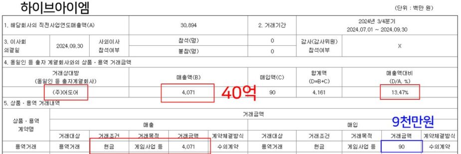 如果你看看HYBE I.M在9月30日發布的公告(產品和服務交易與同一人子公司之間的變更等),他們在第三季度從ADOR收到了40億韓元,用於遊戲業務。該金額佔上一個財政年度銷售額的 13.47%。去年的交易則是相反,ADOR從HYBE I.M那裡收到了7800萬韓元。