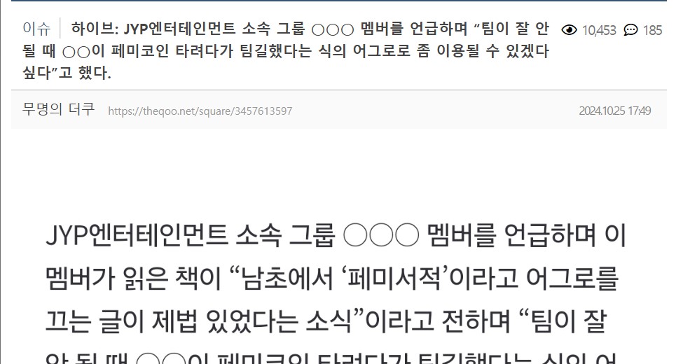 關於JYP旗下團體(可能是NMIXX?)中的成員XXX,有評論提到「男性交友社群中出現了許多標記『女性主義書籍』的相關文章」。評論進一步表示:「當團隊運作不順時,可能會有人利用XX的女性主義話題來吸引關注,借此稱XX是搭上了『女性主義話題熱潮』組成團隊。」