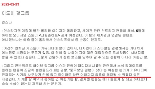 「另外,由於HYBE旗下女團的動態更新較慢,S團隊(LE SSERAFIM)相關的消息更新速度不足,讓粉絲逐漸表達出不滿情緒。」