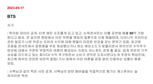 此外,還提到了JYP的朴軫永和SM的李秀滿,並比較房時爀:「當朴軫永特地舉辦演唱會時,往往會出現在年末,而李秀滿也無法放下自我讚美的姿態。因此,房時爀成為了一個更有吸引力的角色,這種形象需求正在逐步擴大。」