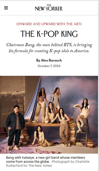 或許是基於這樣的提案進行了企劃,今年10月,美國《紐約客》刊登了一篇針對房時爀的專題文章,標題為「The K-Pop King(K-POP之王)」。