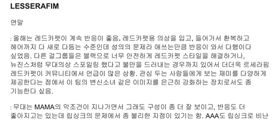 「舞台雖然比MAMA的惡劣條件要好,構成也更具看點,反應也更好,但因為對嘴的問題,稍微有些不利。AAA也因為假唱而受到批評。」(2023-12-20)