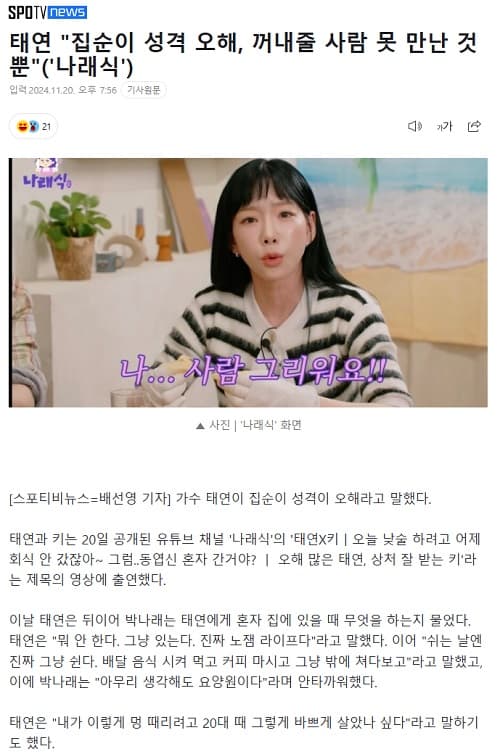 太妍回顧自己的生活方式,坦言:「有時我會想,我20多歲時過著那麼忙碌的生活,是不是就是為了現在這樣放空?」,她繼續說道:「人們會想,『她只會待在家裡』或『她不喜歡喝酒』,所以他們不會邀請我參加活動。」,當Key插話,稱之為「誤解」時,太妍熱情地回應:「我很想念人。我其實喜歡和人相處。」