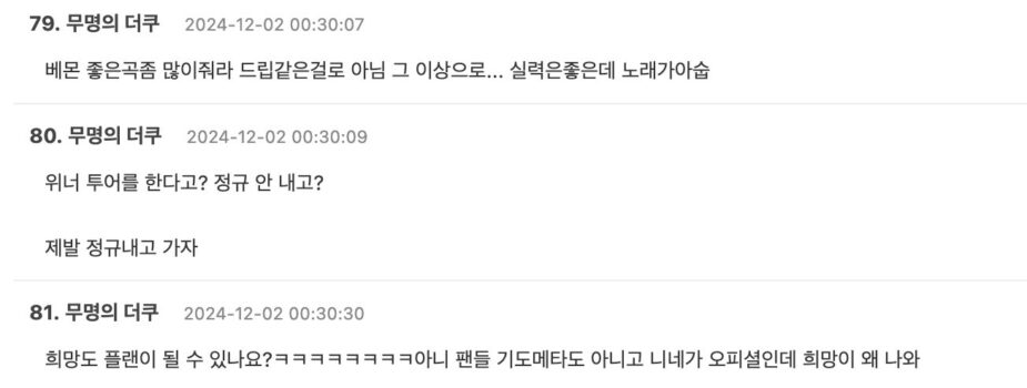 「WINNER到底為什麼要續約?他們裡面有兩個人可以自己製作音樂,卻待在一個一年只發一首新歌的公司裡。其他藝人在服役期間都能發歌呢。」