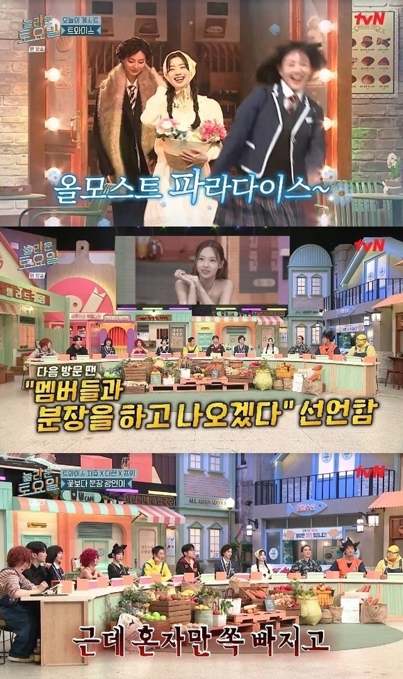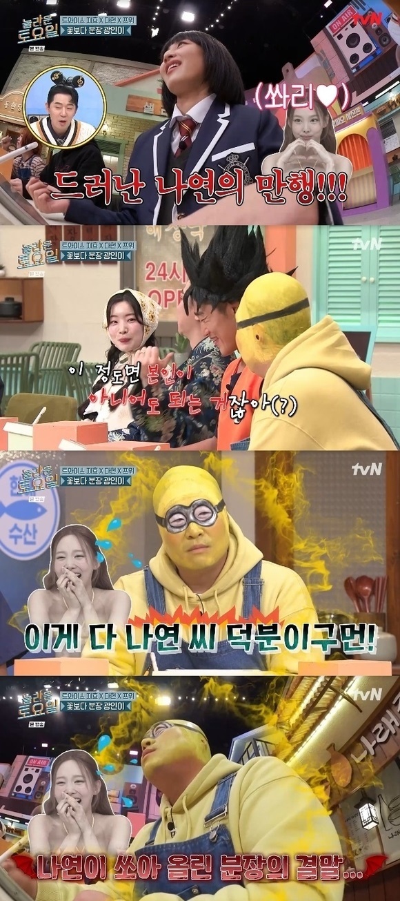 在TWICE成員娜璉的提議下,志效、多賢和子瑜帶來了令人驚艷的變裝表演。