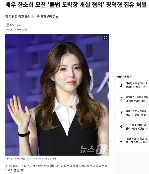 韓國演員韓韶禧的母親因涉嫌經營多處非法賭博場所,近日被法院判處有期徒刑1年,緩刑2年,並需完成120小時的社會服務。