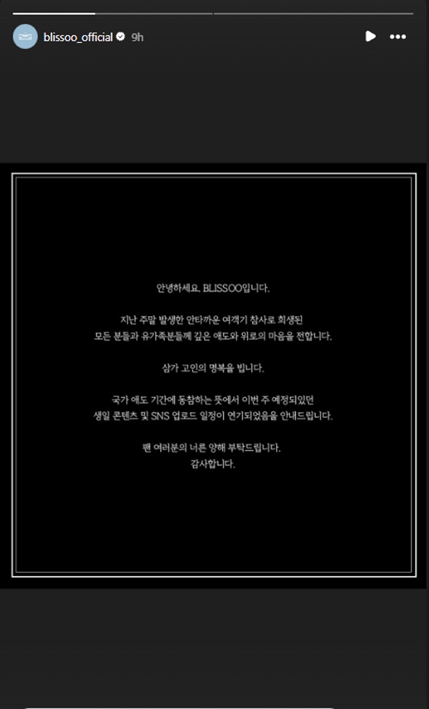12月31日,BLACKPINK成員Jisoo的經紀公司BLISSOO透過官方社群媒體宣布:「我們向週末發生的悲慘客機墜毀事件的所有受害者及其家屬表達最深切的哀悼和衷心的慰問。我們為逝者祈求安息」,以哀悼濟州航空空難的罹難者。
