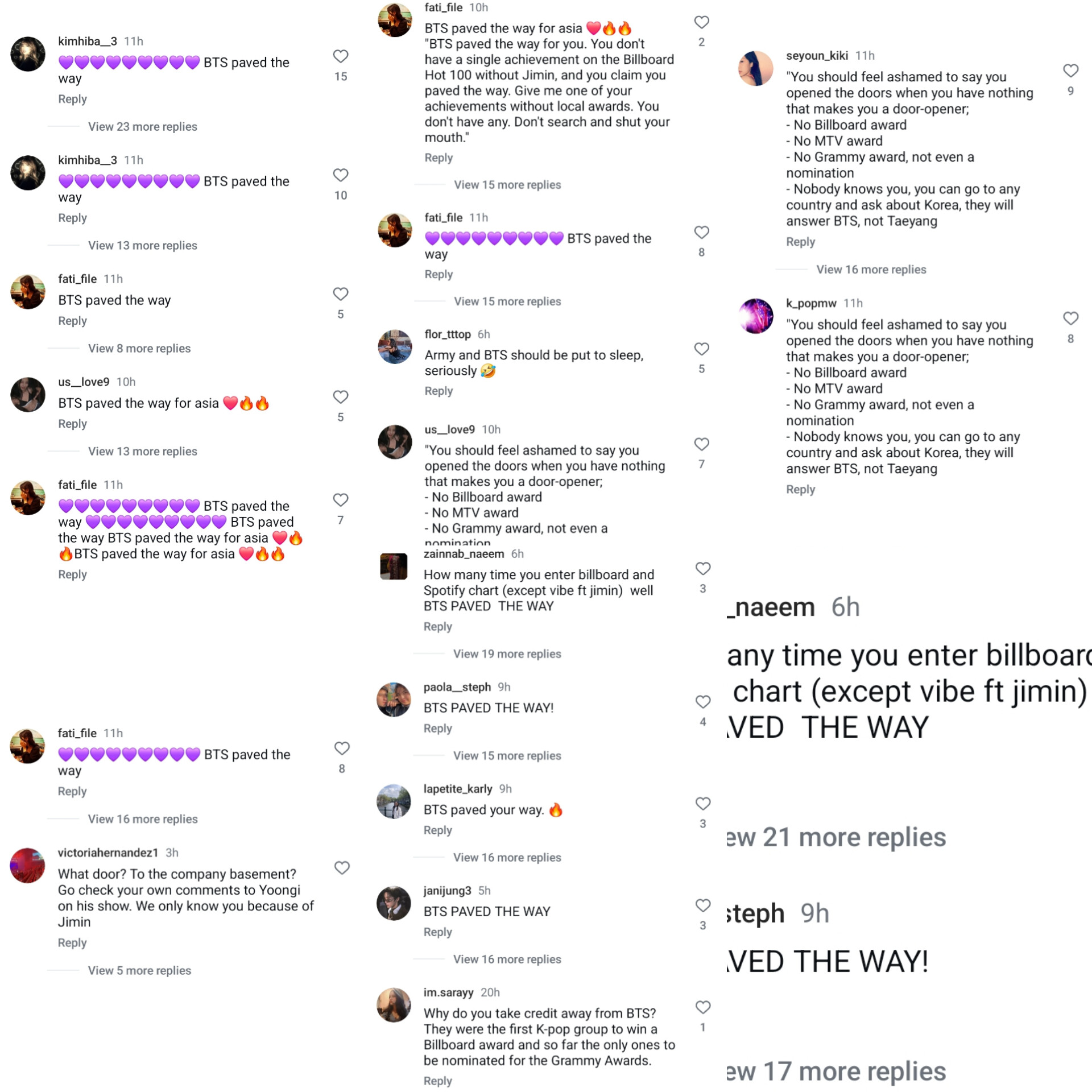 這段採訪截圖曝光後,自認為是「BTS開闢道路」的粉絲ARMY紛紛表達異議。太陽的Instagram瞬間湧入大量「BTS Paved the way」的留言,引發熱議。