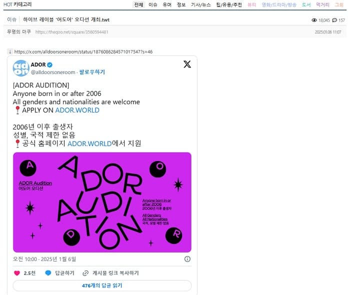 隸屬於HYBE旗下的「ADOR」,目前因「NewJeans」事件備受關注,現已宣布啟動「常設選秀」。