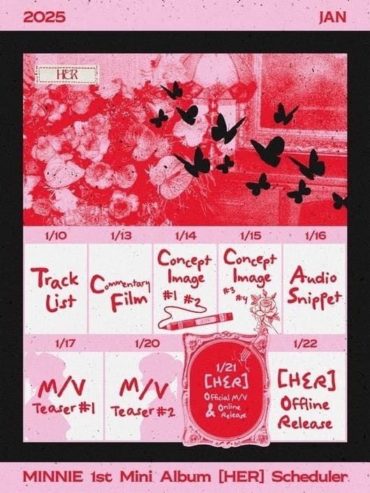CUBE娛樂今天(9日)通過官方SNS公開了Minnie的首張個人迷你專輯《HER》的宣傳日程表。本次預告以紅色和粉色為主題,營造出可愛的氛圍,與之前強烈的回歸預告影片形成鮮明對比,吸引了眾人目光。
