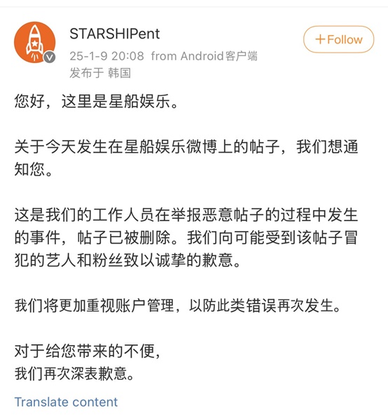 STARSHIP娛樂隨即刪除該照片並發布道歉聲明。經紀公司表示:「此事發生在工作人員舉報惡意照片的過程中。對於此照片造成的不適,我們向藝人及粉絲深表歉意。」並補充說:「我們將徹底加強賬號管理,確保此類錯誤不再發生。」
