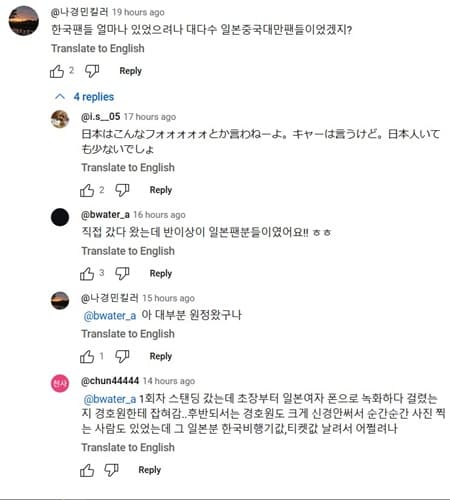 在演唱會相關的粉絲直拍影片評論區,也出現了類似的討論。一則留言詢問:「這場演唱會中,韓國粉絲大約有多少呢?大部分應該是日本、中國或台灣的粉絲吧?」隨後,有人回應:「我親自去了,超過一半的觀眾是日本粉絲。」這些討論顯示,本次公演的觀眾組成相當多元,而非僅限於韓國本地粉絲。