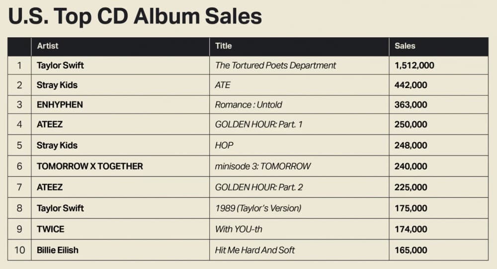 追蹤各娛樂產業趨勢的領先分析平台Luminate,發布了其最新的2024年美國前十名CD專輯銷售排行榜。