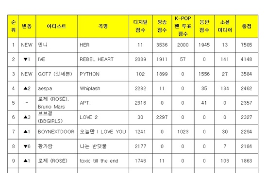 《音樂銀行》於31日透過官方網站公布最新排名,結果顯示Minnie的Solo歌曲《HER》擊敗IVE等強勁對手,奪得冠軍寶座。