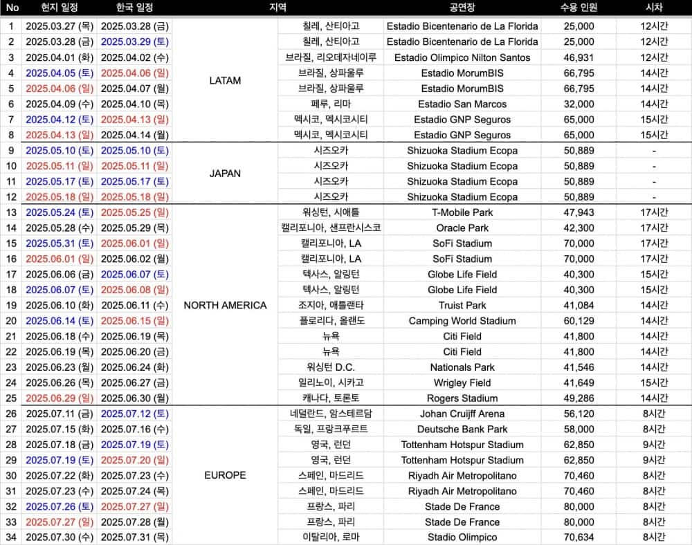 粉絲們很快就注意到這次巡迴演唱會選擇的場地規模非常驚人,有些甚至可容納多達8萬個座位。一些粉絲將所有巡迴演唱會的場地整理成一個圖表,展示了每個場地令人印象深刻的座位容量。