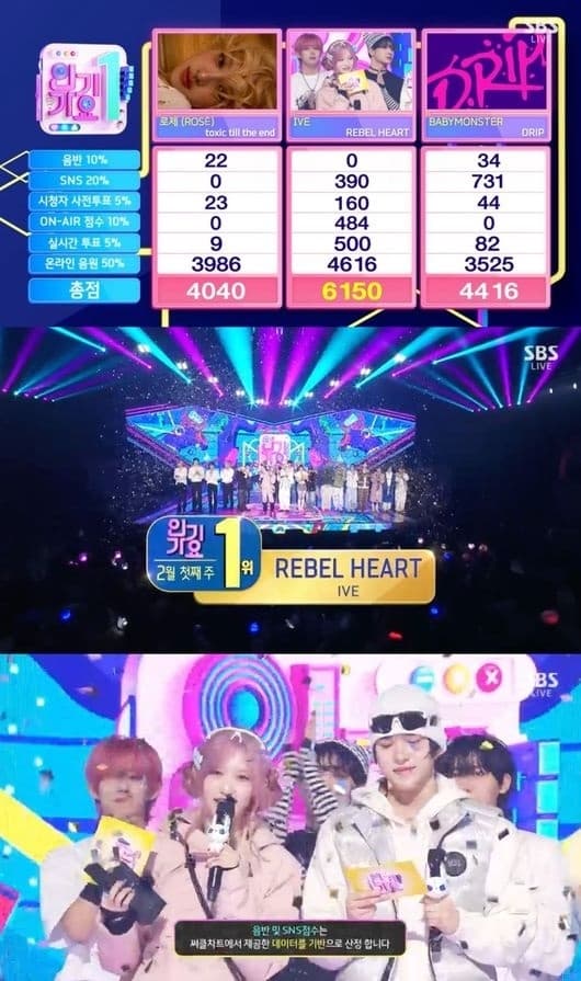 在2月2日播出的 SBS《人氣歌謠》中,IVE《Rebel Heart》、Rosé《Toxic till the end》、BABYMONSTER《Drip》入圍本週1位候補,最終,IVE成功奪冠!