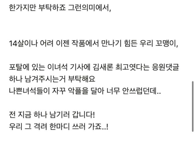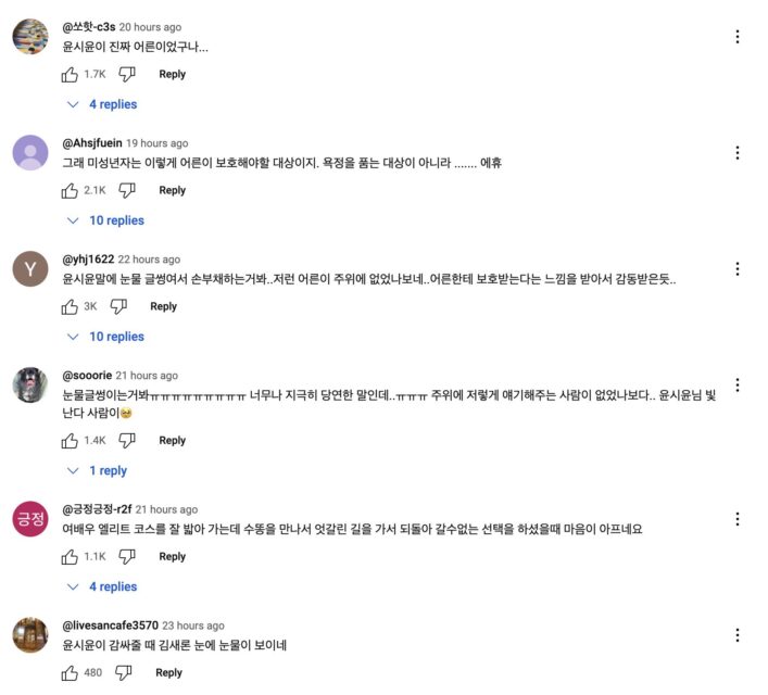 尹施允:「…最後,想為我們的小不點(指金賽綸)拜託大家一件事。畢竟我們差了14歲,大概沒機會再合作了。如果在網上看到關於她的報導,請留下鼓勵的留言,告訴她『妳演得超棒』。總有些酸民惡意攻擊她,看了真的很難受。我現在就要去留言了!大家也一起來寫些打氣的話吧!」
