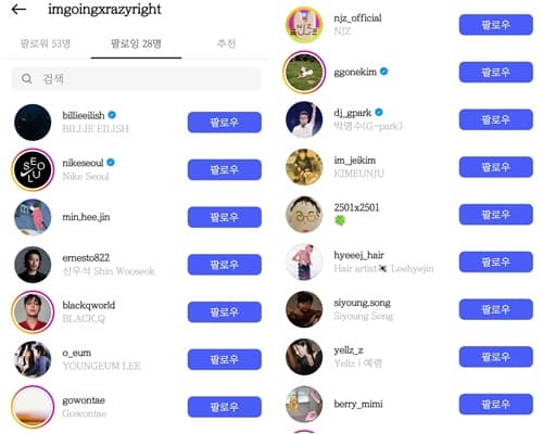 查看追蹤名單時,出現了NJZ以及閔熙珍的帳號。