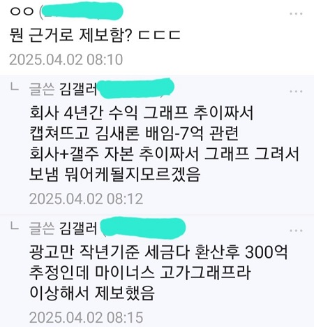 另一位網友詢問該用戶從何處獲得舉報金秀賢逃稅的證據。舉報者解釋說:「我擷取了一張顯示公司過去四年利潤趨勢的圖表並截圖。然後,我創建並發送了一張圖表,描繪了金賽綸的背信行為– 7億韓元,以及相關公司和畫廊所有者的資本趨勢。我不確定會發生什麼事。」,他們繼續說:「根據去年的估計,在計算所有稅款後,僅廣告收入就估計為300億韓元,但圖表卻顯示負值高位,這似乎很奇怪,所以我舉報了。」