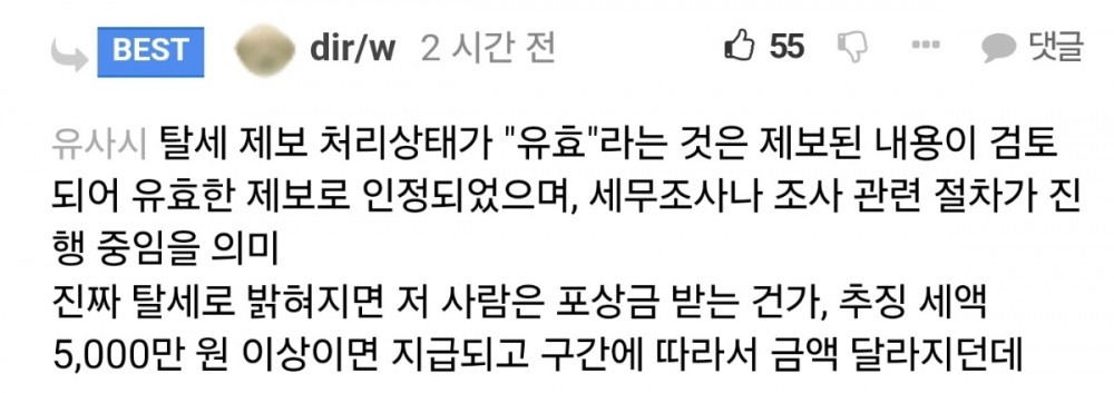 「如果結果證明確實是逃稅,那麼舉報人是否會獲得獎勵?如果追繳的額外稅款超過5000萬韓元,就會發放獎勵,獎勵金額則根據範圍而有所不同。」