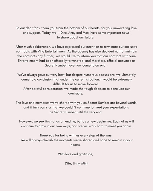 來自印尼的「Dita」於4日透過 Instagram 表示:「Dita、Jinny、Minji 已向Vine娛樂申請解除合約,合約已經終止,隨之,作為SECRET NUMBER的活動也正式告一段落。」