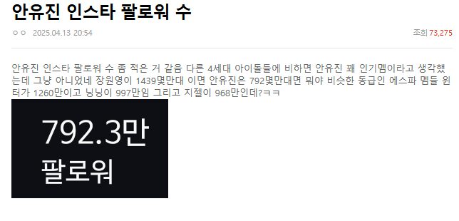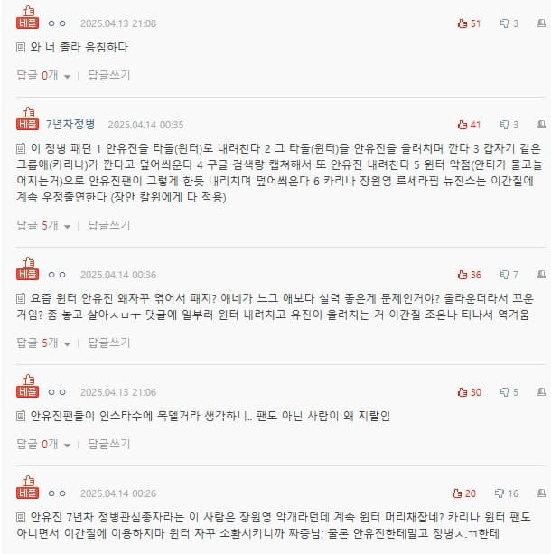 原PO試圖透過將IVE的安兪真的社群媒體數據與aespa的Winter和其他偶像的數據進行比較來貶低安兪真,這引發了韓網友的強烈反彈。