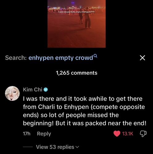 網紅Kim Chi表示:「我當時就在那裡,但從Charli XCX那邊抵達花了相當長的時間(因為我們位於正對面的那端)。所以許多人錯過了開場部分,而到了最後卻擠滿了人。」