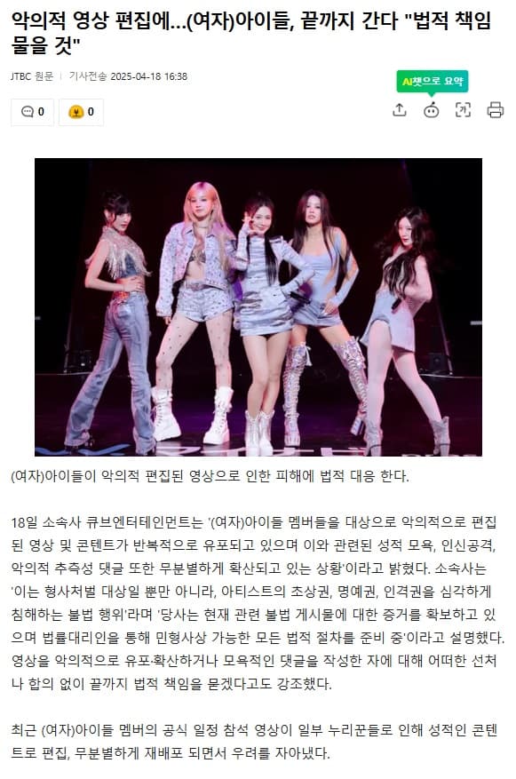 今日(18日),(G)I-DLE所屬經紀公司CUBE娛樂表示:「針對 (G)I-DLE成員們,惡意剪輯的影片與相關內容正被不斷散佈,當中包含性侮辱、人身攻擊及惡意猜測等不分對象地擴散。這些行為屬於可受刑事處罰的違法行為,嚴重侵犯了藝人的肖像權、名譽權及人格權。」
