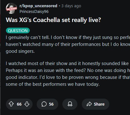 ▼「用手持麥克風就是真人唱,用頭戴麥克風就是假唱。我之前在HITC看過,覺得音軌很奇怪,聽起來不像是真人唱。不是因為『太完美沒有失誤』,而是跟其他同台表演者比,音質差太多了。」