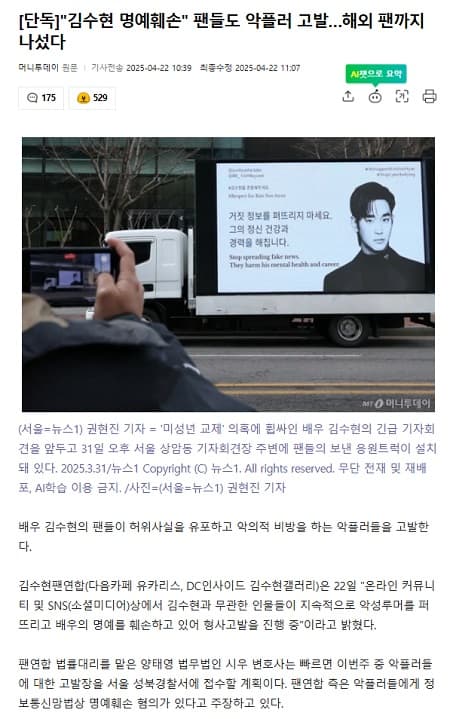 粉絲聯合會表示:「在網路社區和社群媒體上,一直有與金秀賢無關的人士針對他散播惡意謠言和誹謗。我們目前正在追究刑事責任。」