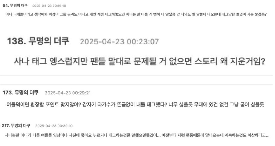 「就算他們不熟,舞台上見過面後標記一下有什麼問題?我兩個都不是粉,但一般人都會這樣做,其他藝人也一樣。如果去看演唱會或有人客串演出,也會標記對方啊。這有什麼大不了?」