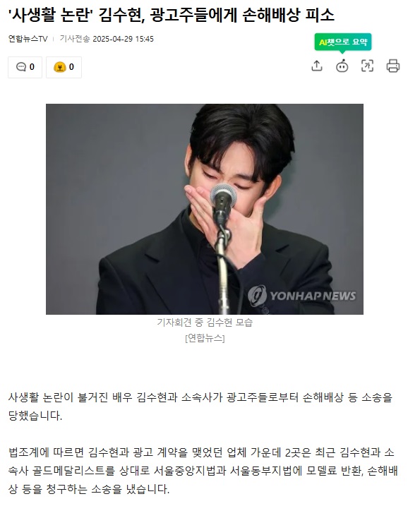 據韓國時間4月28日的法律界人士透露,兩家與金秀賢簽訂廣告合約、代號為A和B的公司,已對金秀賢及其經紀公司GOLDMEDALIST提起訴訟,要求退還代言費並賠償損失。