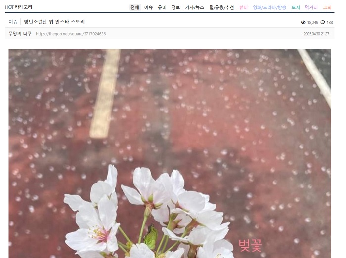 於韓國時間5月1日,V在距離退伍僅剩40天時,透過他的Instagram限時動態,與粉絲分享了櫻花照以及他的健身日常,讓粉絲們掌握他的日常生活近況。