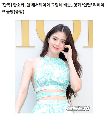 據報導,女演員韓韶禧正在考慮出演即將翻拍的2015年好萊塢電影《高年級實習生》的韓國版女主角。