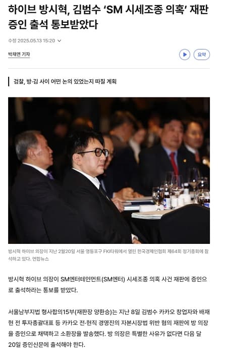 根據韓聯社報導,HYBE創辦人房時爀已被法院傳喚,將在與SM娛樂股價操縱指控相關的審判中作證。