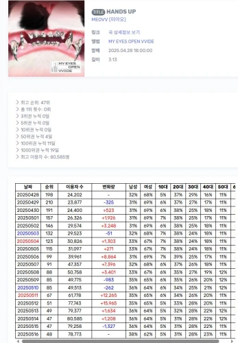 儘管MEOVV飽受嚴苛批評,他們的新曲《Hands Up》在韓國主要排行榜(Melon日榜)中創下個人生涯新高,第48名,在音樂節目上,此次回歸也拿下出道以來的首個冠軍(目前已累積2冠)。整體成績持續上揚。對於並非大公司旗下的中小型事務所團體來說,已算是「表現出色」。嚴厲的評價,也可視為對其高度期待的證明。